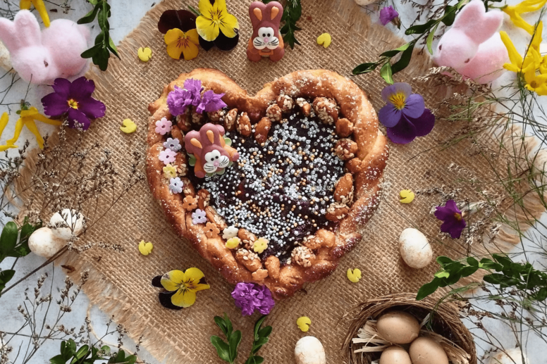 Wszystkie składniki na ciasto zagniatamy. Ciasto dzielimy na dwie części – jedną mniejszą, a drugą większą. Tę większą częścią wylepiamy foremkę w kształcie serca, a z reszty formujemy wałek, delikatnie skręcamy i wyklejamy boki foremki. Ciasto nakłuwamy, obciążamy kulkami ceramicznymi i pieczemy przez ok. 20–30 minut w 170°C. Studzimy.