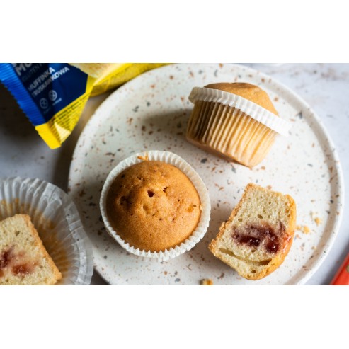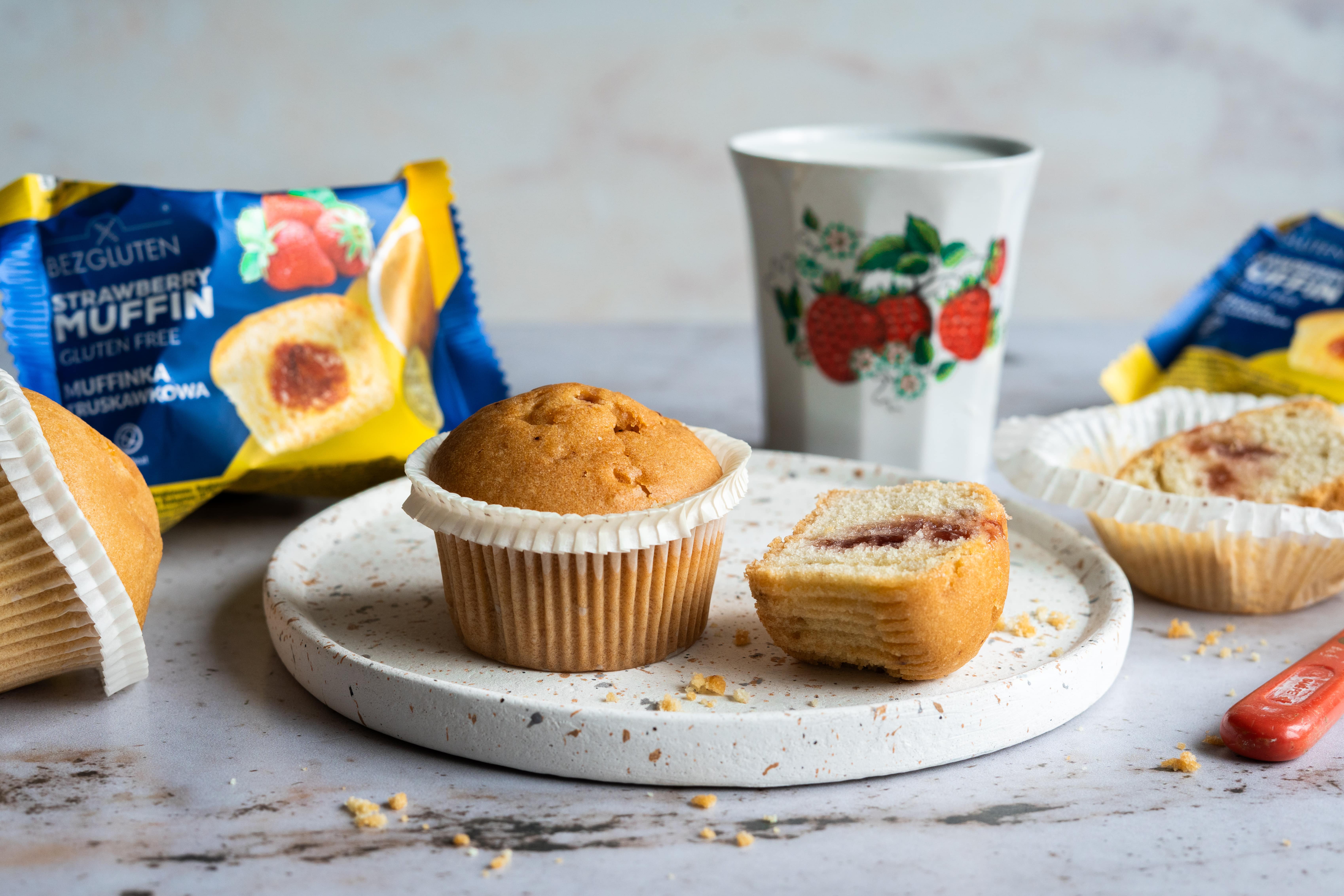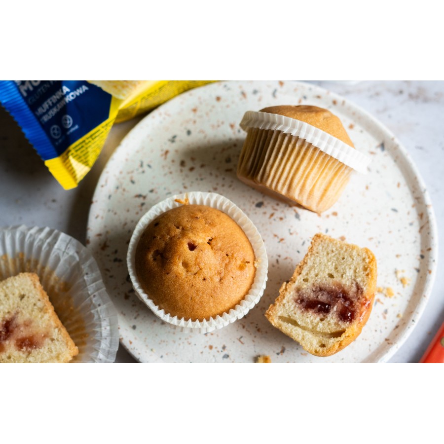 Muffinka truskawkowa bezglutenowa 60g- delikatne, puszyste ciasto z nadzieniem z truskawek – idealna przekąska dla osób na diecie bezglutenowej. Świetna do kawy, herbaty, na drugie śniadanie czy jako słodki dodatek do lunchboxa. Dzięki wygodnemu opakowaniu możesz zabrać ją ze sobą wszędzie i cieszyć się smakiem owocowej słodyczy bez glutenu.