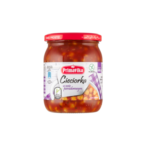 Składniki: woda, cieciorka 46%, koncentrat pomidorowy 23%, cebula, cukier, skrobia kukurydziana, hydrolizat białka roślinnego (zawiera soję), olej rzepakowy, sól, bulion wegetariański [maltodekstryna, sól, warzywa suszone (marchew, natka pietruszki, liście selera, por, cebula), cukier, olej rzepakowy, kurkuma, pieprz czarny, lubczyk liść, aromat naturalny], przyprawy ziołowe (zawierają gorczycę), przeciwutleniacz: kwas askorbinowy = witamina C, przyprawy, aromat z ekstraktu drożdżowego.