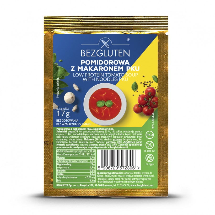 Doskonała opcja dla osób z fenyloketonurią, które szukają smacznej, lekkostrawnej zupy. Wystarczy dodać wodę, by przygotować aromatyczną pomidorową z makaronem dostosowaną do diety PKU. Bezglutenowa, niskobiałkowa i szybka w przygotowaniu – idealna na szybki obiad lub ciepłą przekąskę.
