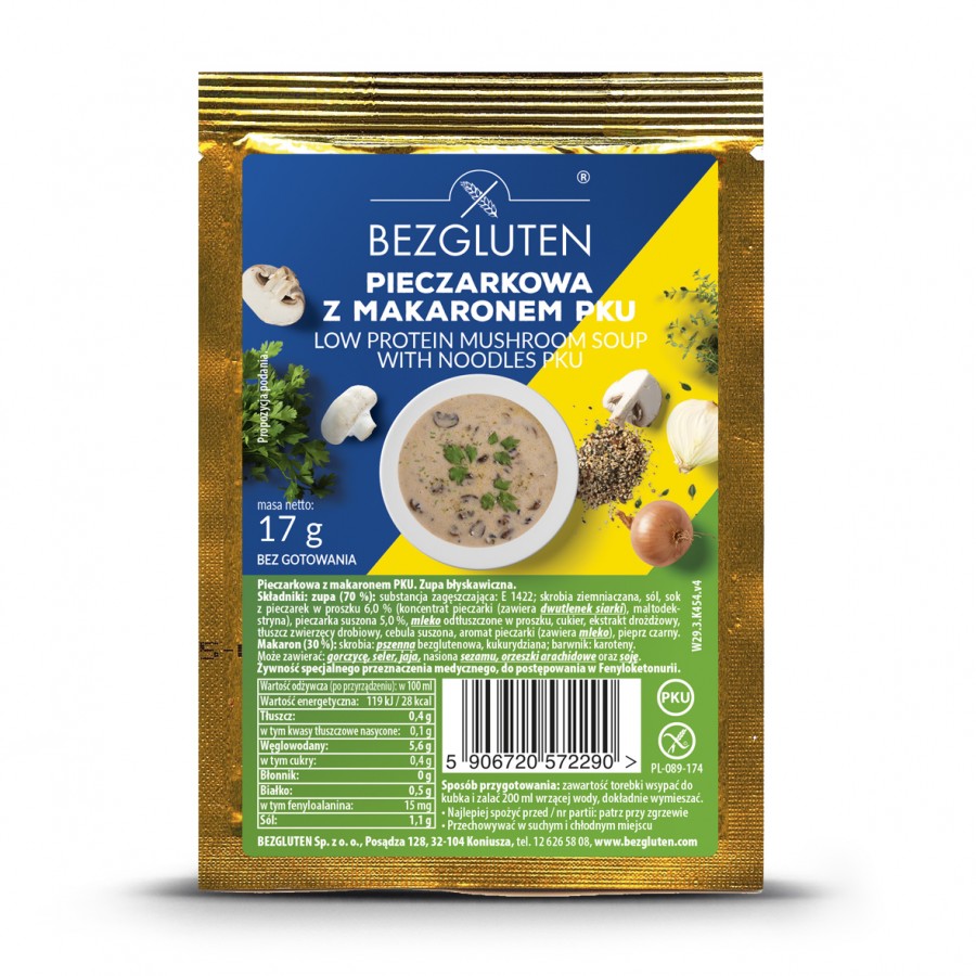 Idealna opcja dla osób z fenyloketonurią, które chcą cieszyć się smakiem pysznej, delikatnej zupy pieczarkowej. Wystarczy dodać wodę, by przygotować aromatyczną zupę z makaronem, dostosowaną do wymagań diety PKU. Bezglutenowa, niskobiałkowa, a do tego szybka i łatwa w przygotowaniu – doskonała na szybki obiad lub ciepłą przekąskę.